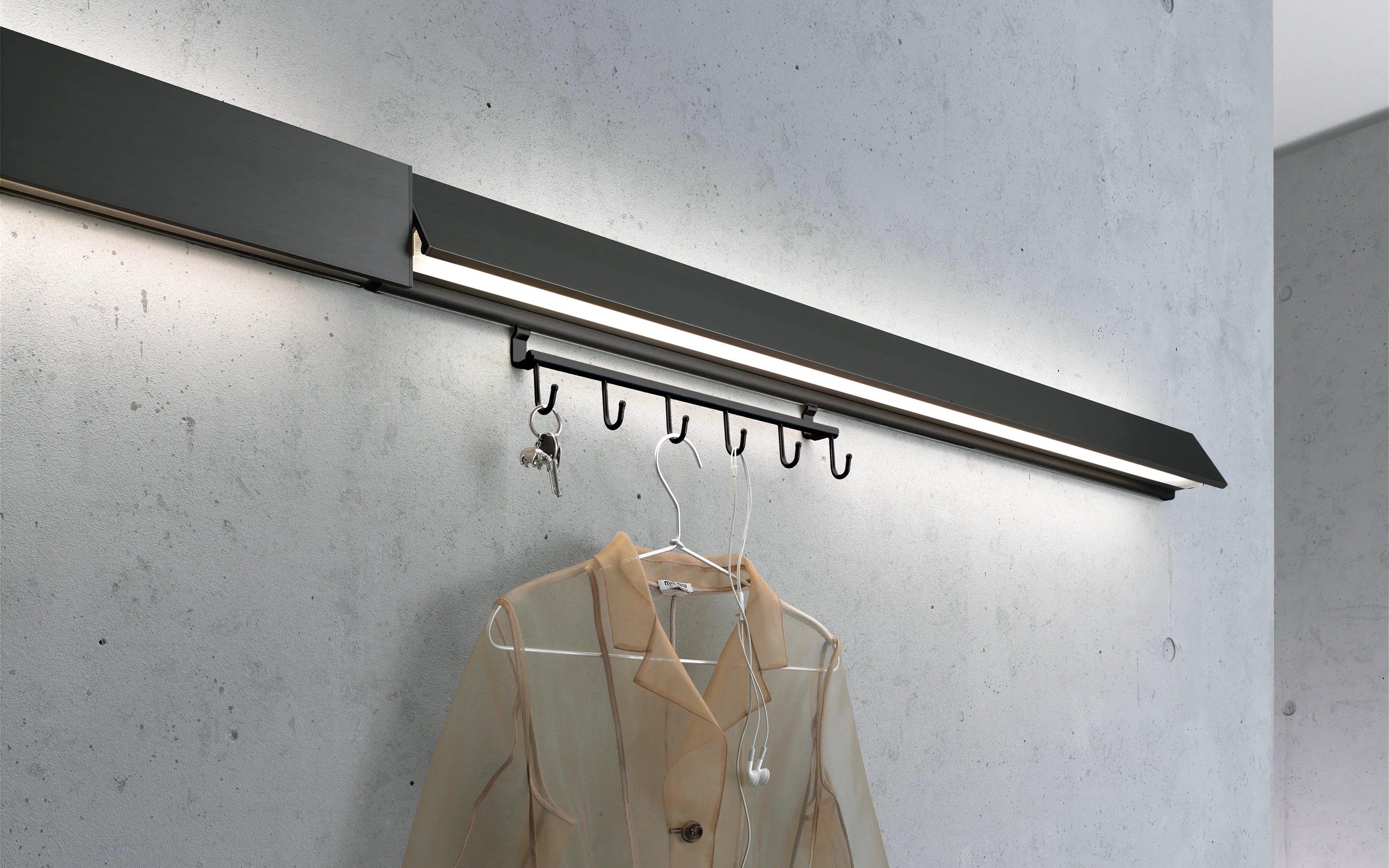 GERA Hook hält nicht nur Jacken, Schlüssel sowie andere Accessoires griffbereit, sondern taucht jeden Eingangsbereich zugleich in wahlweise warm- oder kaltweißes Licht. Eine verborgene Schiene nimmt die praktische und verschiebbare Hakenleiste auf und sorgt so für ein aufgeräumtes Erscheinungsbild.